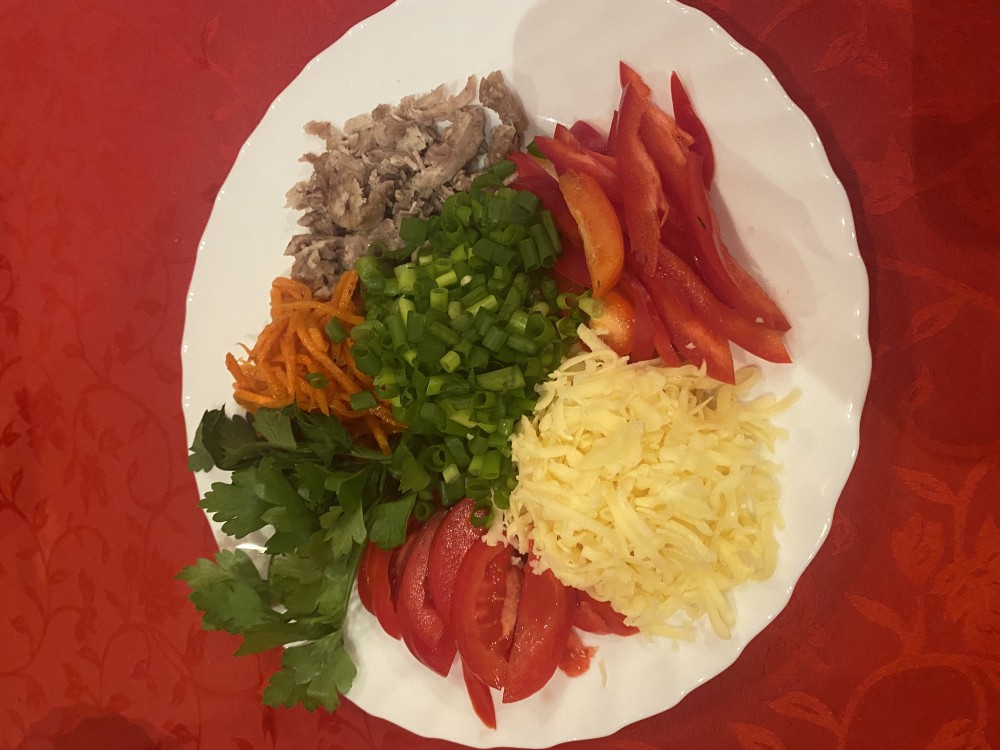 Свинина отварная, помидоры свежие, перец болгарский, морковь по-корейски (морковь свежая, масло растительное, специи, соль, сахар), сыр сливочный, лук зеленый, майонез