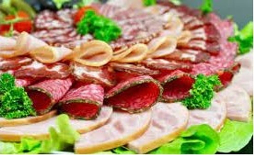 Мясные и колбасные копчености, огурцы маринованные, зелень свежая