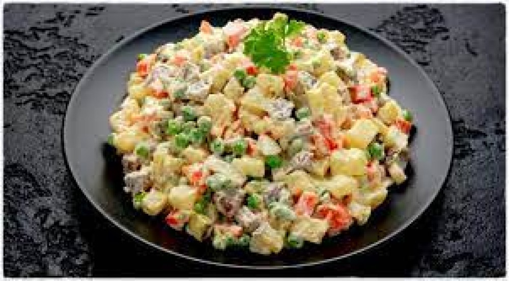 Ветчина из мяса свинины, отварные овощи: картофель, морковь; огурцы маринованные, яйцо куриное отварное, зеленый горошек консервированный, лук репчатый свежий майонез, зелень свежая