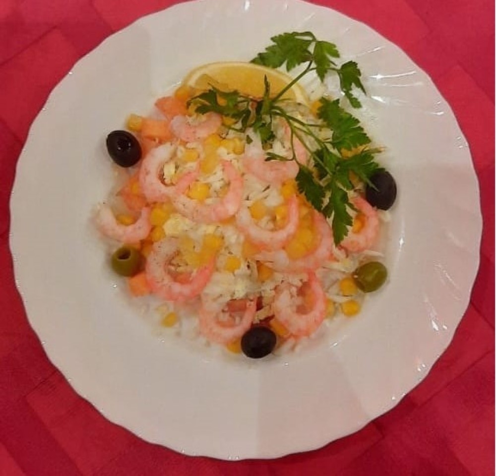 Кальмарыотварные, креветки отварные, семга с/с ,кукуруза, яйцо, лимон, маслины, зеленьсвежая, майонез