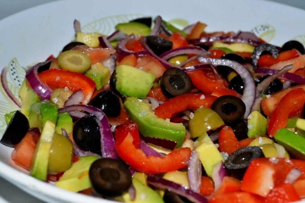 Помидоры свежие, огурцы свежие, перец болгарский свежий, оливки, оливковое масло, лук репчатый свежий, свежевыжатый сок лимона, зелень свежая