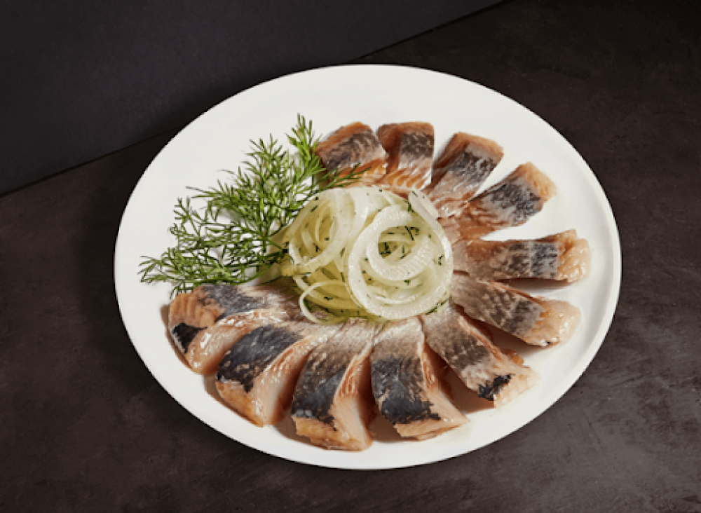 Филе слабосолёной сельди, лук маринованный, масло растительное, зелень свежая