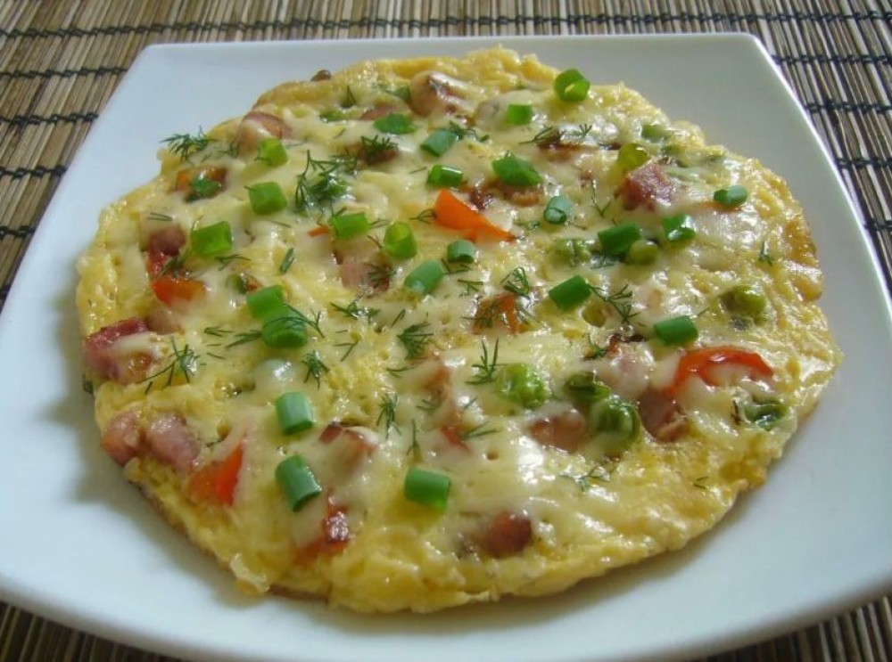 Яйца куриные, ветчина свиная, помидоры свежие, сыр сливочный, лук репчатый свежий, зелень свежая