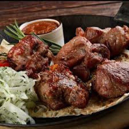 Каре барашка, хлеб ржаной, лук репчатый свежий, соус Кавказ (помидоры в собственном соку, мята свежая, базилик, орегано, перец белый, кинза свежая, сахарный песок)