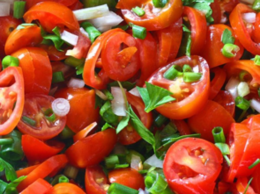 Помидоры свежие, лук зеленый свежий, зелень свежая. Заправка на выбор.