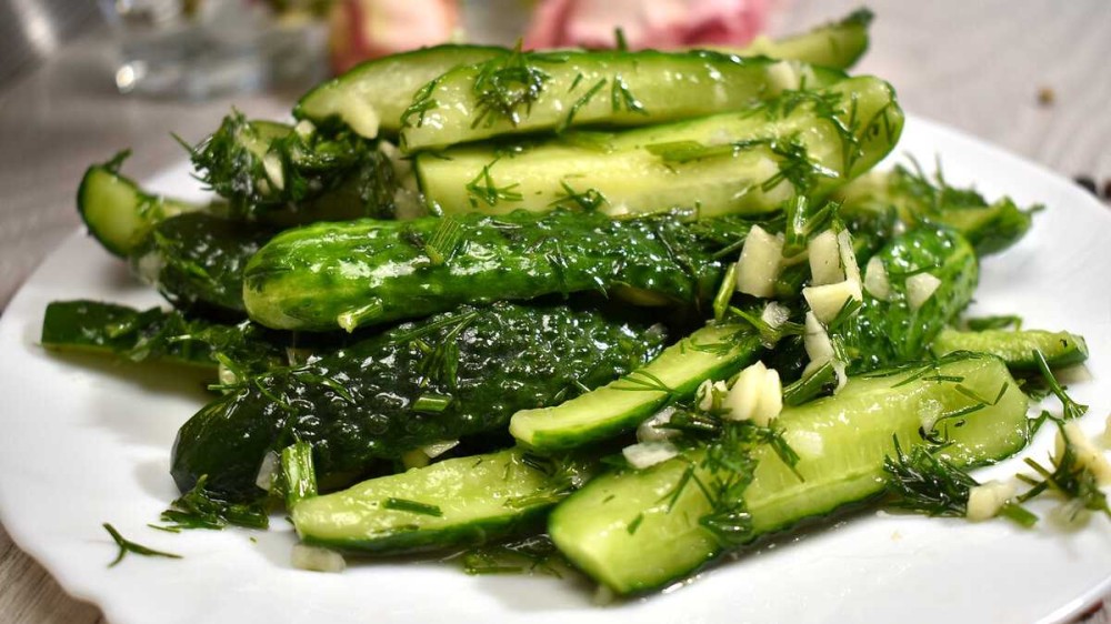 Огурцы собственного посола, соль пищевая, перец черный молотый, сахарный песок, чеснок свежий, зелень свежая