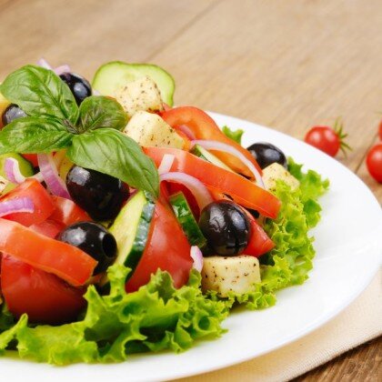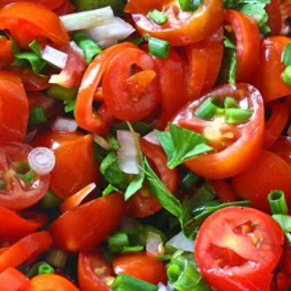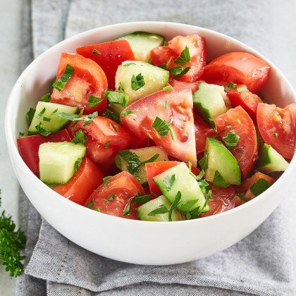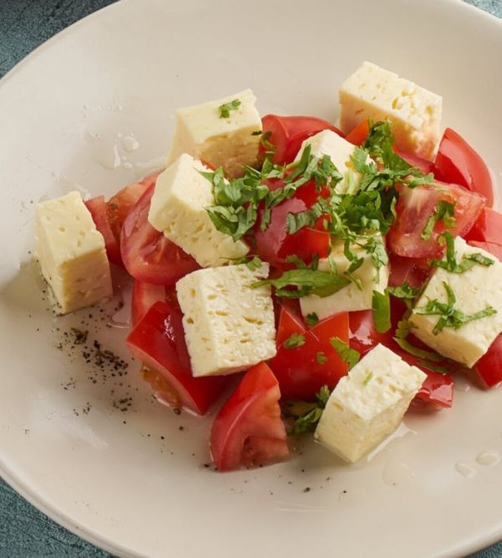 Помидоры свежие, брынза рассольная, кинза свежая, масло оливковое