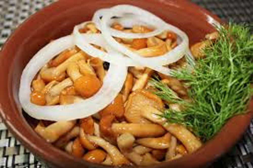 Ассорти маринованных грибов, лук репчатый свежий, масло растительное, зелень