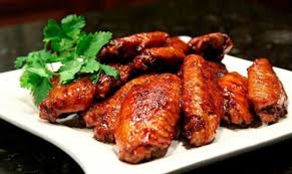 Крыло куриное в фирменном маринаде (апельсины, мед, соевый соус, специи); обжаренное во фритюре; обсыпанное кунжутом; кисло-сладкий соус, хлеб.