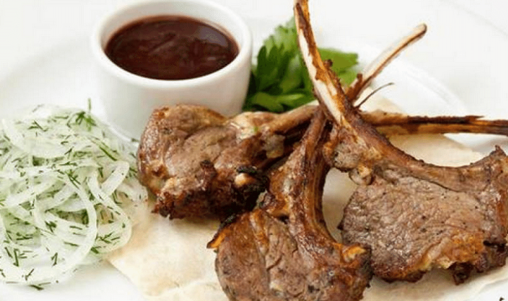 Каре барашка, хлеб ржаной, лук репчатый свежий, соус Кавказ (помидоры в собственном соку, мята свежая, базилик, орегано, перец белый, кинза свежая, сахарный песок)